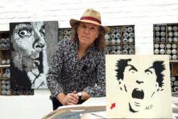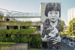 He is part of the first generation of French urban artists using this medium with Epsylon Point, Blek le Rat, and Miss.Tic. While his early works were selfies, soon his aerosol cans would project onto the walls both the portraits of the great figures of the “rock generation,” of cultural life as well as anonymous, all V.I.P. (Very Important Stencils). The all-black and gray images of Jef Aérosol are the novel of an era being written. One of his emblematic works is the “Sitting Kid,” a young boy, solitary and pensive, who will be found from the Great Wall of China to Ushuaia, from London to New York, accompanied by the unmistakable red arrow, the artist’s signature.